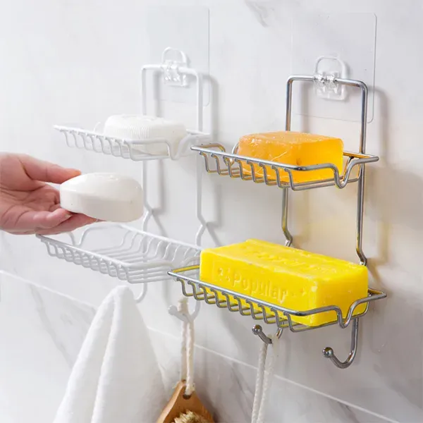 The basket design of this soap dish can prevent soggy soap and pooling which helps the soap dry quickly and keeps bar soap for longer usage,prevent the soap from moldy and caking.Two hooks can hang bath balls towels and shavers and other supplies to make the bedroom or kitchen cleaner.