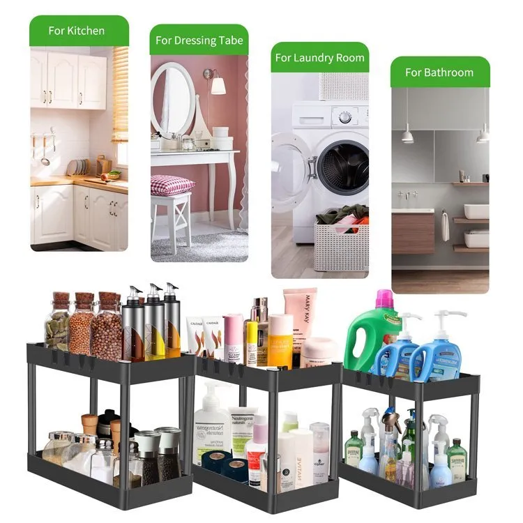 Widely use: The under sink organizer can be put in the cabinet, on the bathroom counter, by the washing machine, and in other places you want to store it.