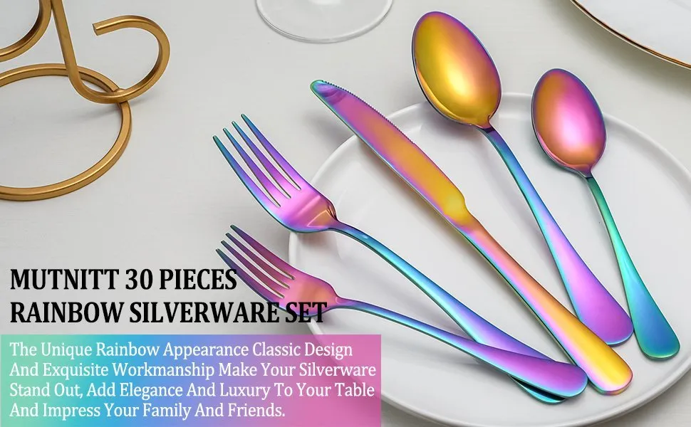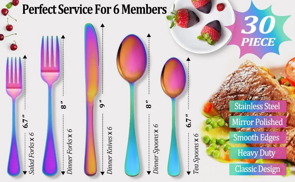 • 【30 PCS RAINBOW SILVERWARE SET FOR 6】: This colorful stainless steel flatware set comes with 6 Dinner Knife, 6 Dinner Forks, 6 Dinner Spoons, 6 Salad/Dessert Fork and 6 Dessert/Tea Spoons, essential for families or restaurants. The stainless steel flatware set is also an irreplaceable dining tool whether it is for daily use or for preparing dinners or parties.