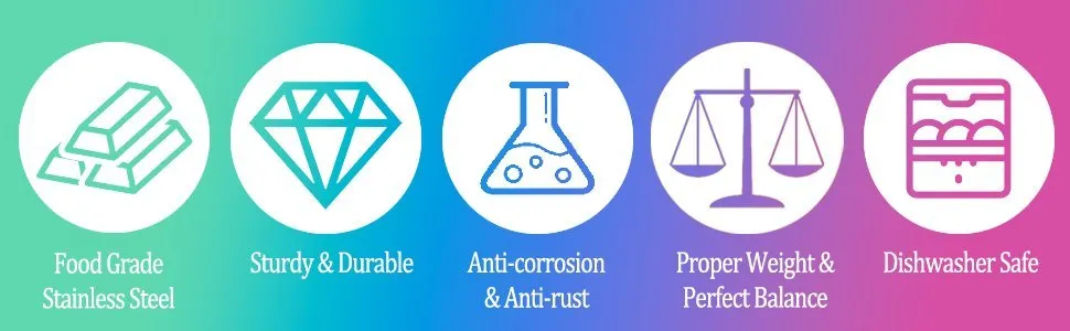 • 【PROPER WEIGHT AND ERGONOMIC HANDLE】: Unlike other brands, the curvature of our utensil handles are designed according to the posture of the hand, and the appropriate weight and perfect balance are added to ensure maximum comfort during use that avoids you feel tired. Moreover, the smooth edges ensure safety and no scratches.