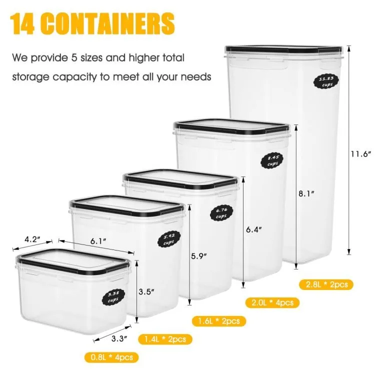 The 14 PCS Cereal Storage Containers are Set with a lid to keep them fresh and crunchy. Each storage container has a closed 4-sided locking system that creates a seal that ensures no air or water gets in, keeping your grains super fresh and dry, it’s a great chip container for the pantry and helps you store food longer.