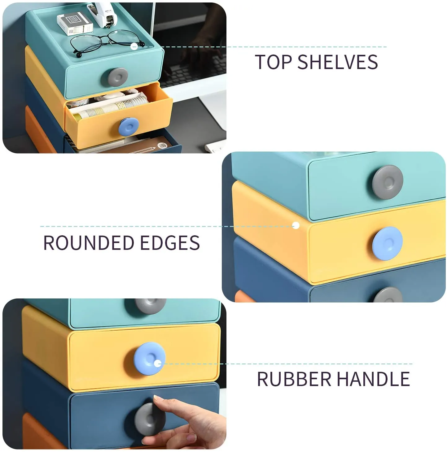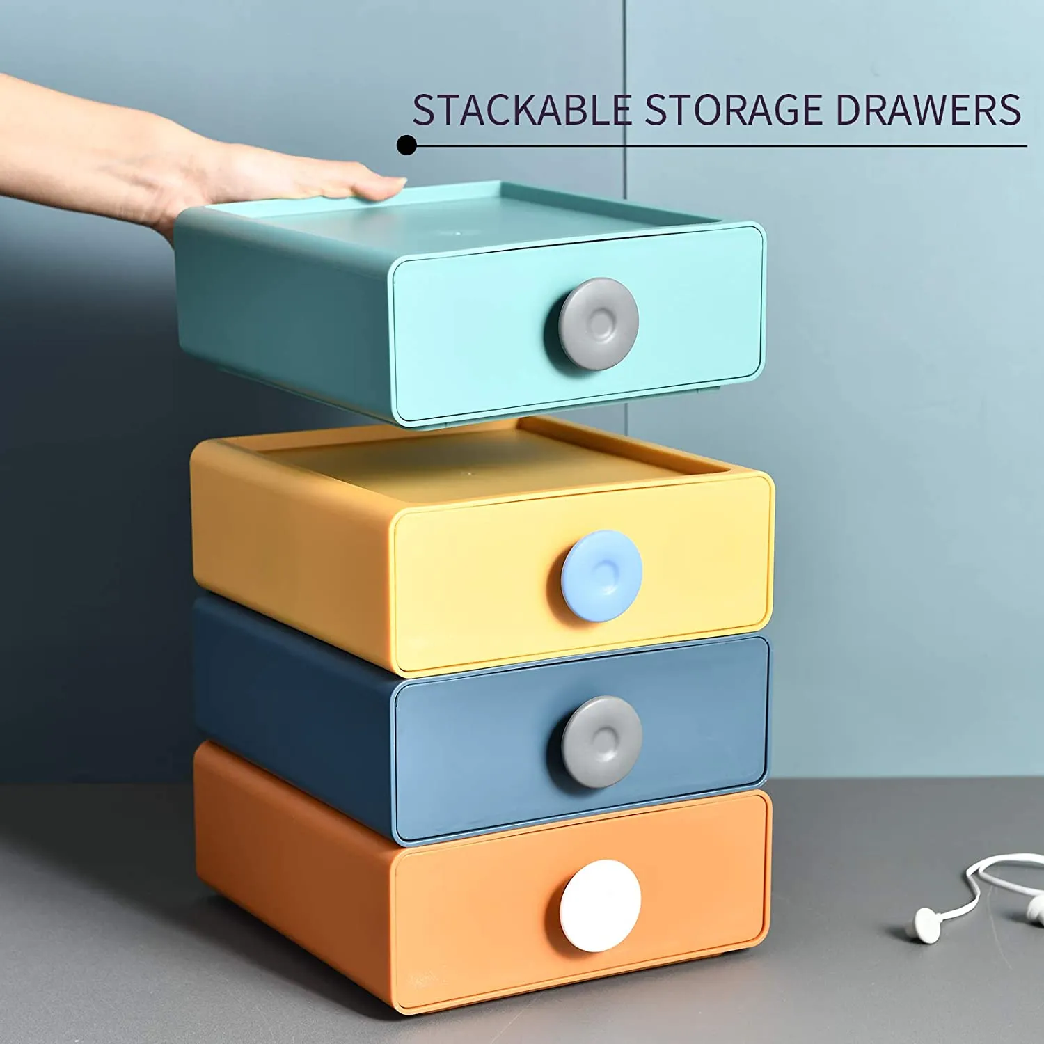 We are committed to giving our customers the best experience, so we make each individual plastic drawer organizer measure 7.87″ (L)x 8.27″ (W)x 3.15″ (H), 4 drawers desk organizers stacked together measure 7.87″ (L)x 8.27″ (W)x 12.6″ (H). The big capacity will provide you with a better experience. Try our Colorful Bulk Stackable Drawer!