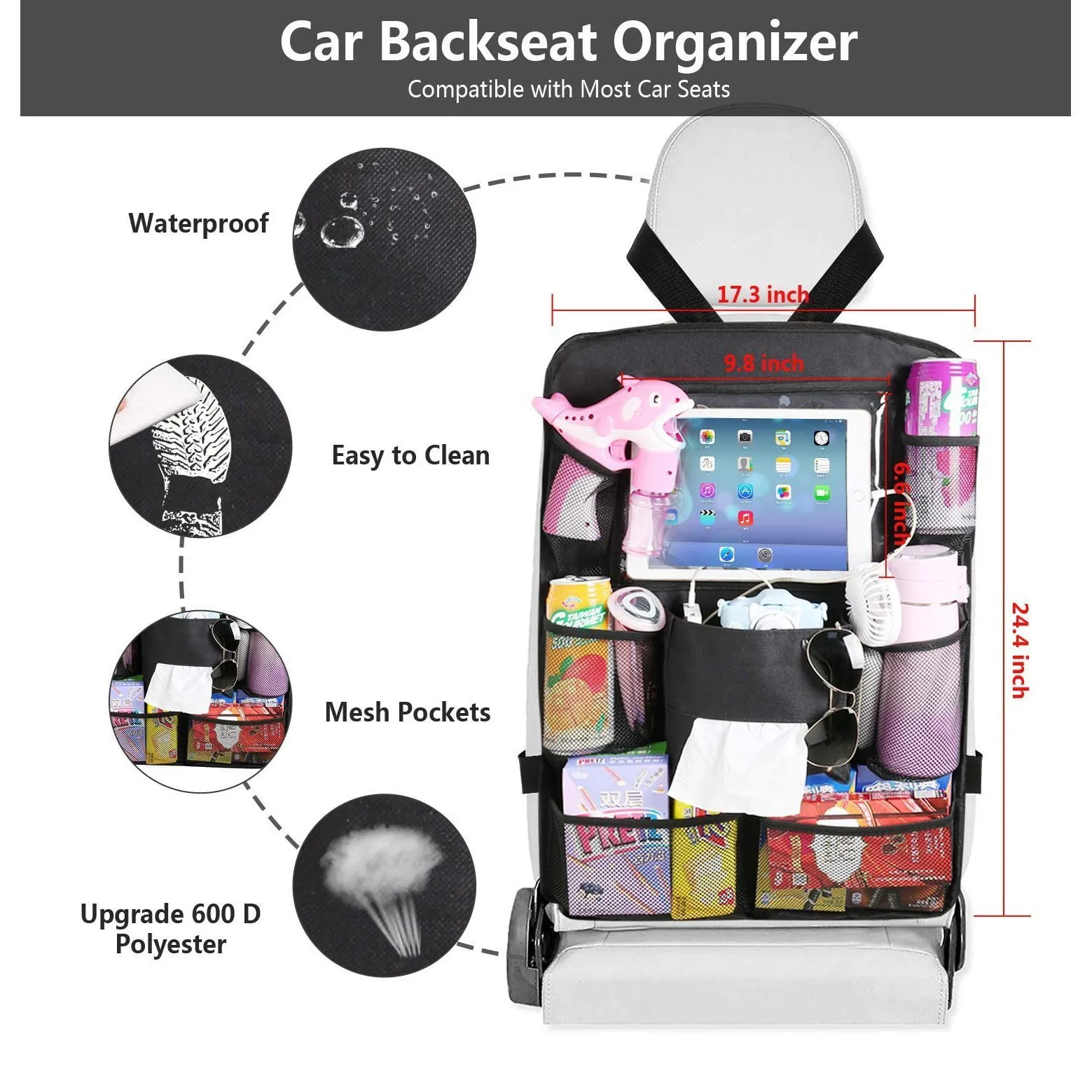 [Friendly and washable Materials] The main material of the Car Backseat Organizer is 600D polyester, which protects your seat from scratches, spills, stains, scratches, dirt, dirt and wear. The product is perfect for those with children and pets!