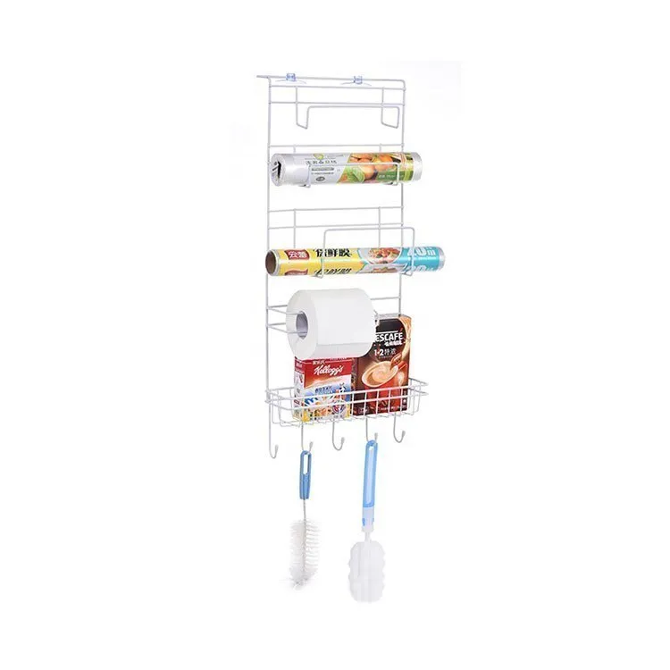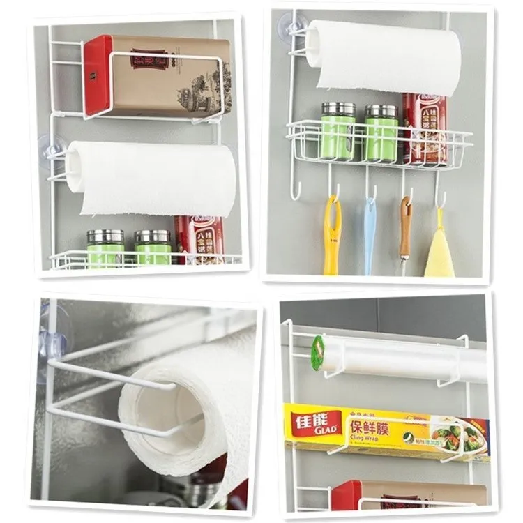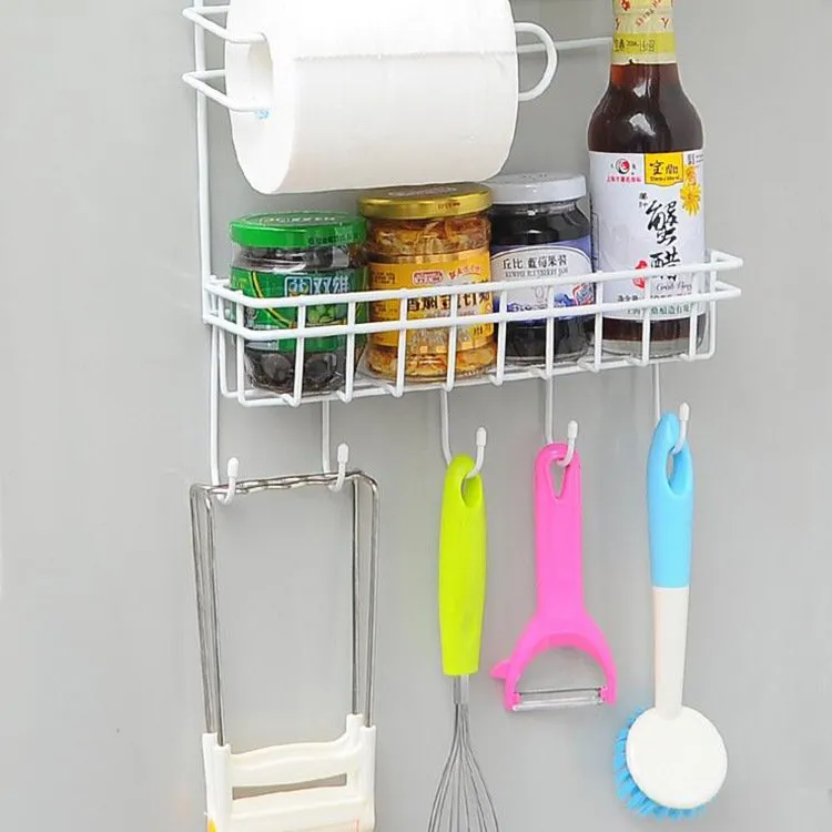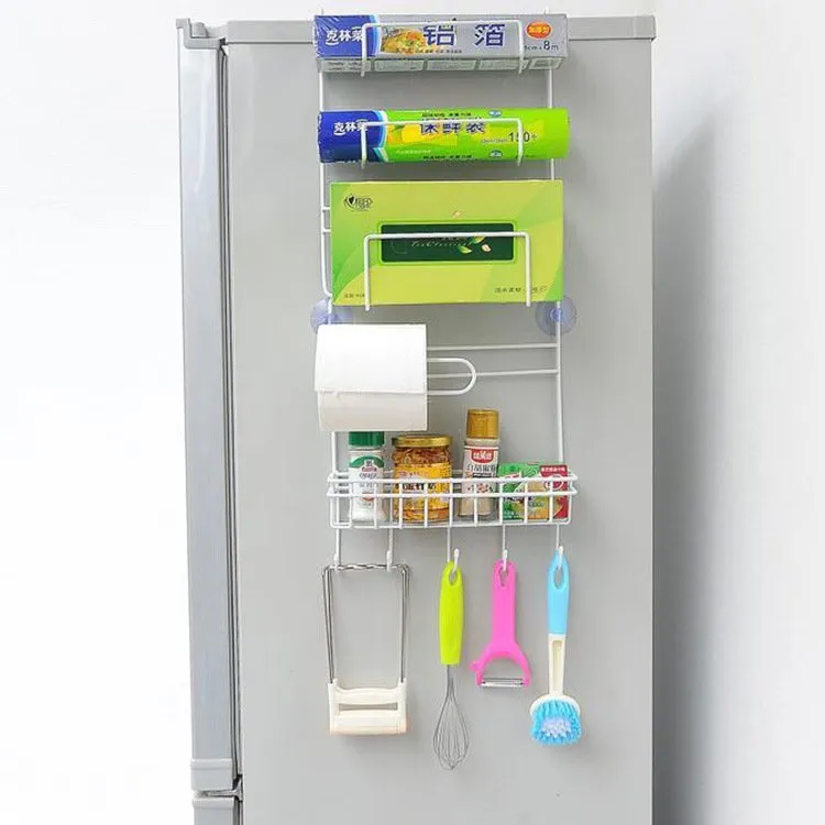 【Multiple storage methods】The upper part of the refrigerator rack can store toothpaste, paper rolls, and plastic wrap, the lower part can store spice bottles, and the bottom part can hang shovels, scoops, spoons, etc.