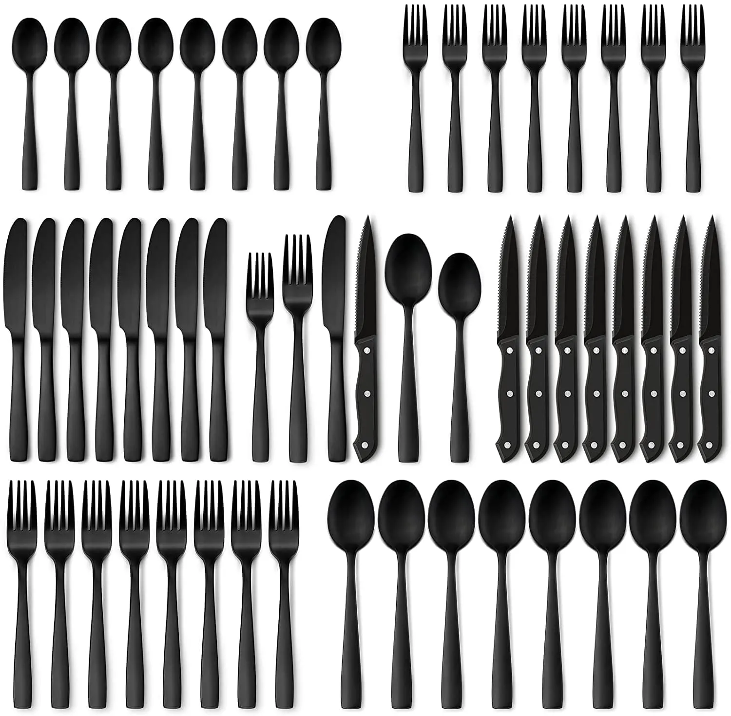 • 48 PCS STAINLESS STEEL FLATWARE SET FOR 8 includes eight dinner forks, eight salad forks, eight steak knives, eight dinner spoons, and eight teaspoons, all of which are necessary for families or restaurants. The set is additionally an indispensable feasting instrument whether it is for everyday use or for getting ready meals or gatherings.