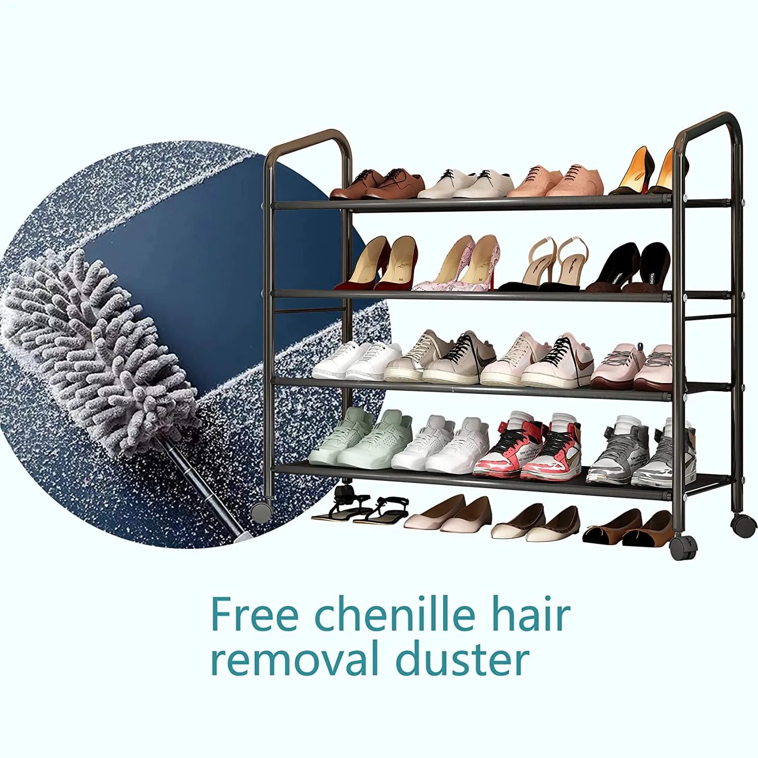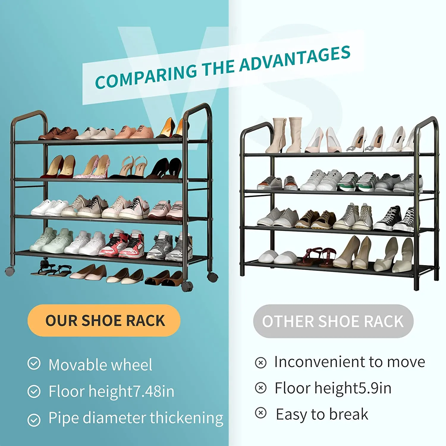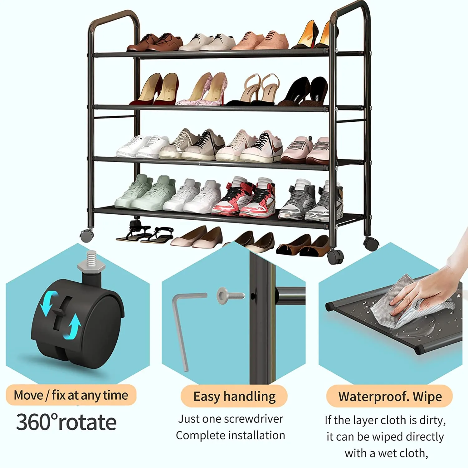 Metal shoe rack with wheels. Even on uneven floors, the adjustable shoe rack can withstand the level test to protect your ceramic tiles and wooden floors from scratching.