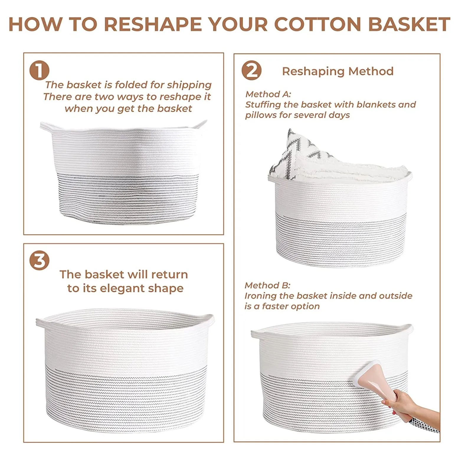 Note: The cotton rope basket comes in collapsed. It will get back to its best shape if topping it off with towels or covers. Quick smoothing of the wrinkles by pressing it.
